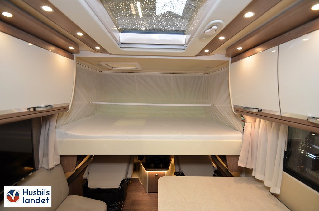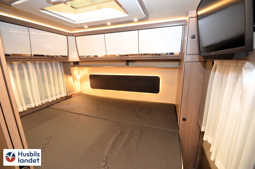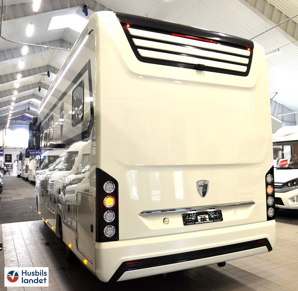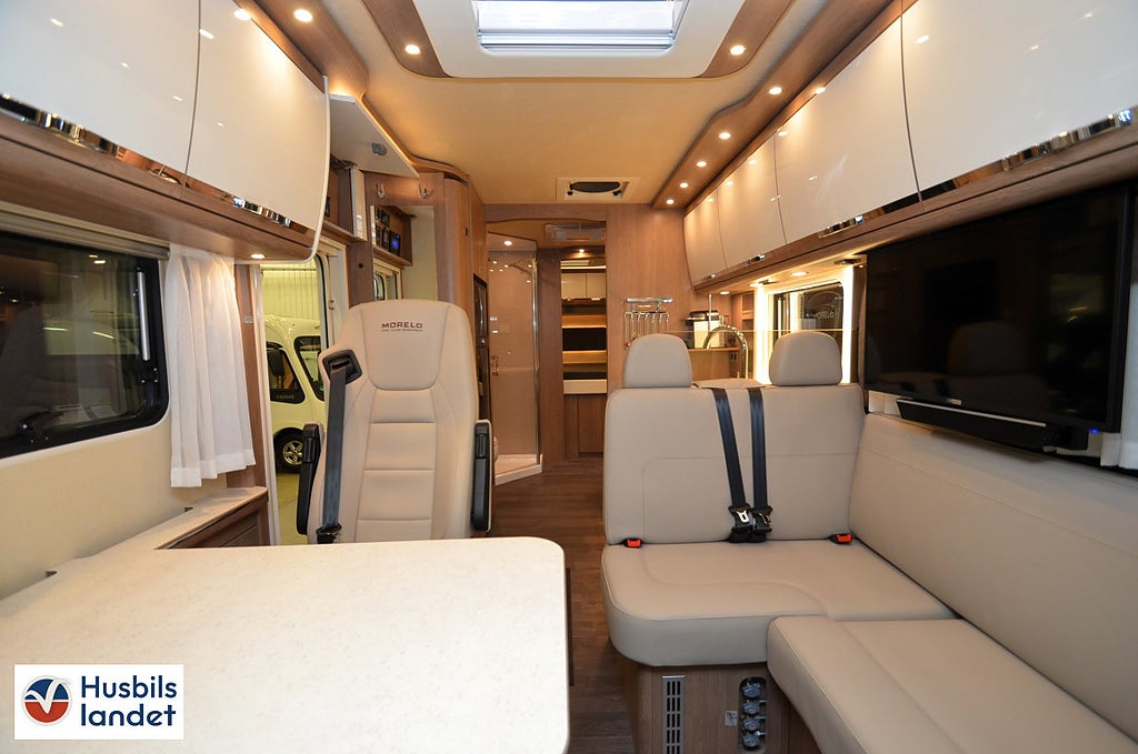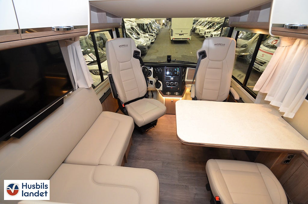 Dubbelbädd Tvärställd säng, Keramisk toalett med ca 200 ltr. fast monterad tank (LOFT), Bältesplatser för 2 personer i multifunktionssoffa, Barsittsgrupp (passagerarsidan) med justerbart enkelsäte och multifunktionsbänk. (ej för 79L, LED-belysning på förarsidan, Midi Heki taklucka i sovrum (istället för standard takfönster), Heki 3 i bodel (istället för standardtakfönster), Belyst MORELO logga i front, 0 m med LED-belysning dimmbar med fjärrkontroll², Lättmetallfälgar MORELO Silver till framaxel med spårbreddning. Stålfälgar med navkapslar på bakaxeln, med automatisk nivellering², C:a 200 ltr. bränsletank³, 230 V förbrukare kopplade över inverter (minst 2 st Lithium-batterier nödvändigt), Takmonterad luftkonditionering monterad i badrum eller hall mellan dusch och toalett, med fjärrkontroll (ökar fordonshöjden + 130 mm, MORELO LOFT STICKER UT REDAN FRÅN STANDARDUTRUSTNINGEN MED SITT KRAFTIGA CHASSI FÖR STÖRRE LASTFÖRMÅGA OCH SIN BREDD PÅ 2, EXTRAUTRUSTAD MED 200L bränsletank. Elektrisk markis 6M. Dieselvärmare. Hydrauliska stödben. Lättmetallfälgar Morelo Silver. Elektropaket. Navigationssystem med demonterbar 10" touch-skärm. Elektrisk frontsäng. Solceller 2x130W. Panoramatakfönster i bodel. Takmonterad luftkonditionering. Luftfjädring på bakaxel och mycket mycket mer.. Kontakta säljare för komplett utrustningslista!